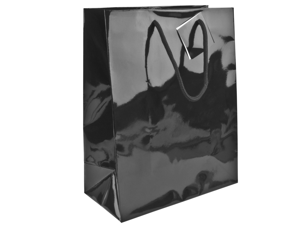 Glänzende Geschenktüten in Schwarz, kleines Modell. Maße: 170 x 120 x 75 mm. Verkauft in Packungen mit 5 Stück.