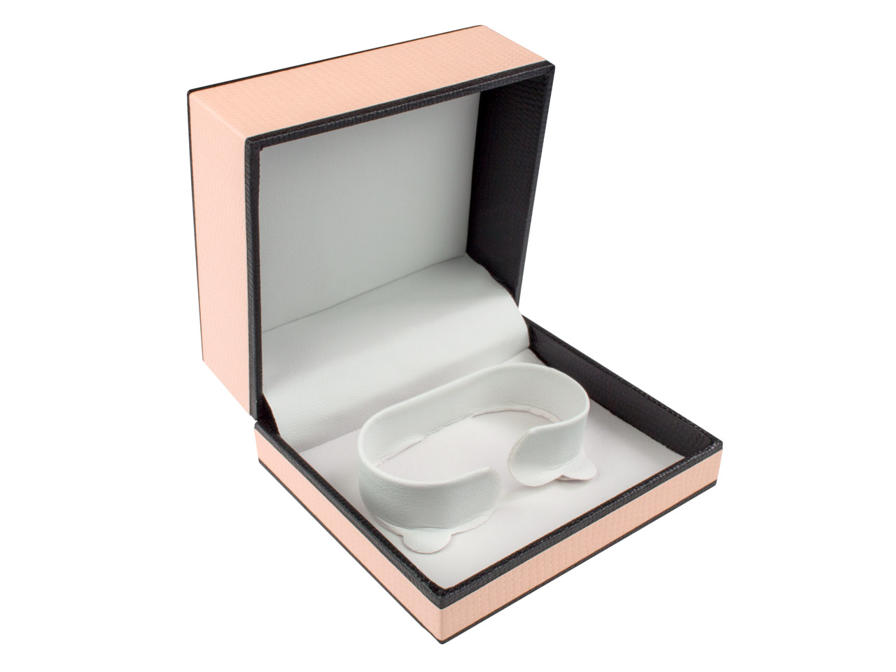 Dieses Etui für ein starres Armband misst im geschlossenen Zustand ca. 81 x 89 x 46 mm. Es ist aus Vintage Rose Kunstleder in Schlangenoptik mit schwarzen Kanten für ein raffiniertes Finish. Di...