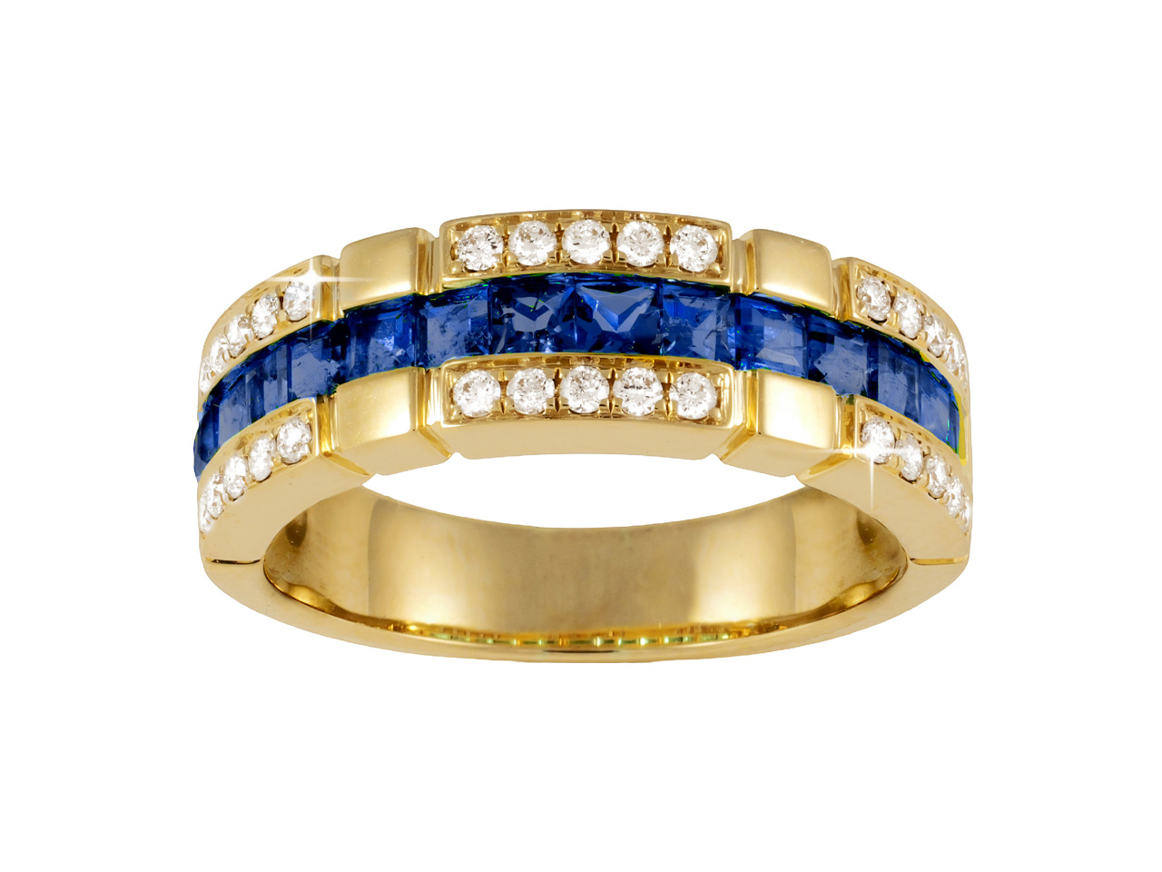 Ring 3 Reihen 7 Mm, Diamanten 0,30 Ct Und Prinzess-saphire 1,28 Ct, Gelbgold 18 Kt, Fingergröße 54 - XLFRA56H