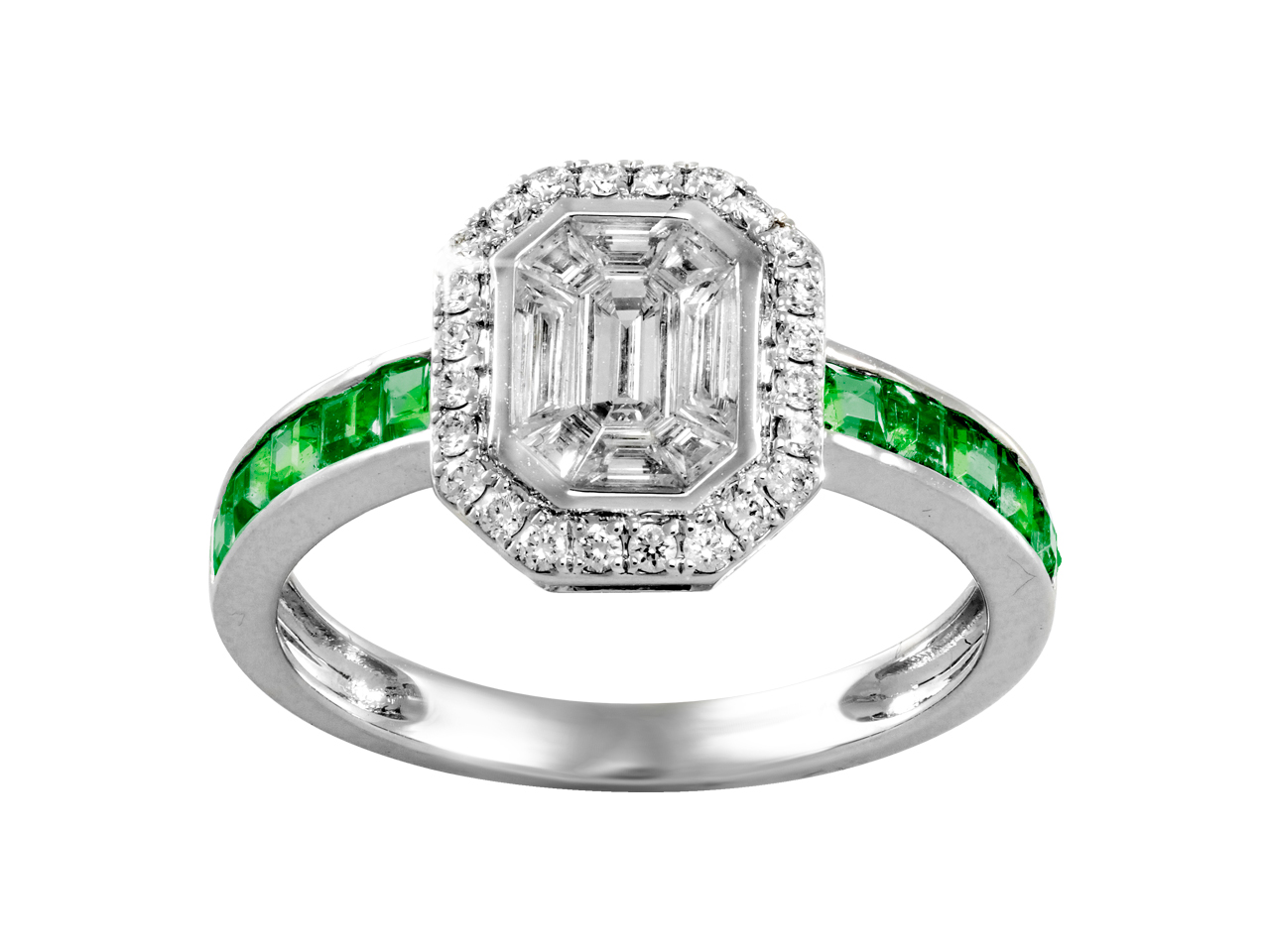 Ring Harmonie 9 X 11 Mm, Runde Diamanten Und Baguettes 0,47 Ct, Smaragd Prinzessschliff 0,53 Ct, Graugold