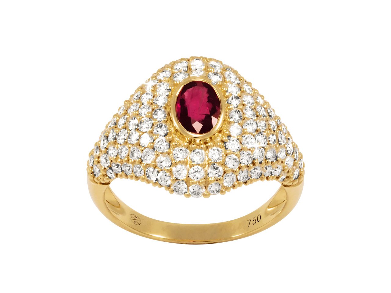 Ring Hypnose 16 Mm, Diamanten 1,45 Ct Und Ovaler Rubin 0,52 Ct, Gelbgold 18 Kt, Fingergröße 54