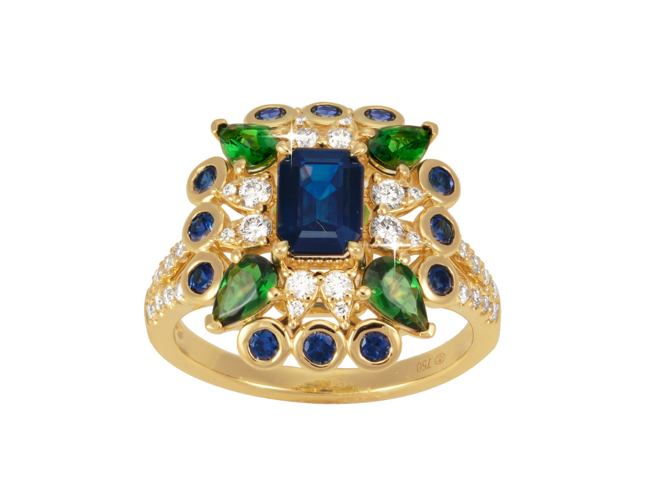 Ring Rio 16 X 18 Mm, Diamanten 0,49ct, Blaue Saphire 1,75 Ct Und Grün E Granate 0,80 Ct, Gelbgold 18 Kt, - XLFRA63H