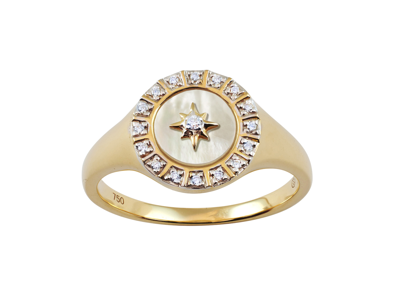 Siegelring 10,50 Mm, Perlmutt Mit Nordstern-muster, Diamantenumrandung0,07ct, Gelbgold 18k, Ringgröße 52 - Standard Bild - 1