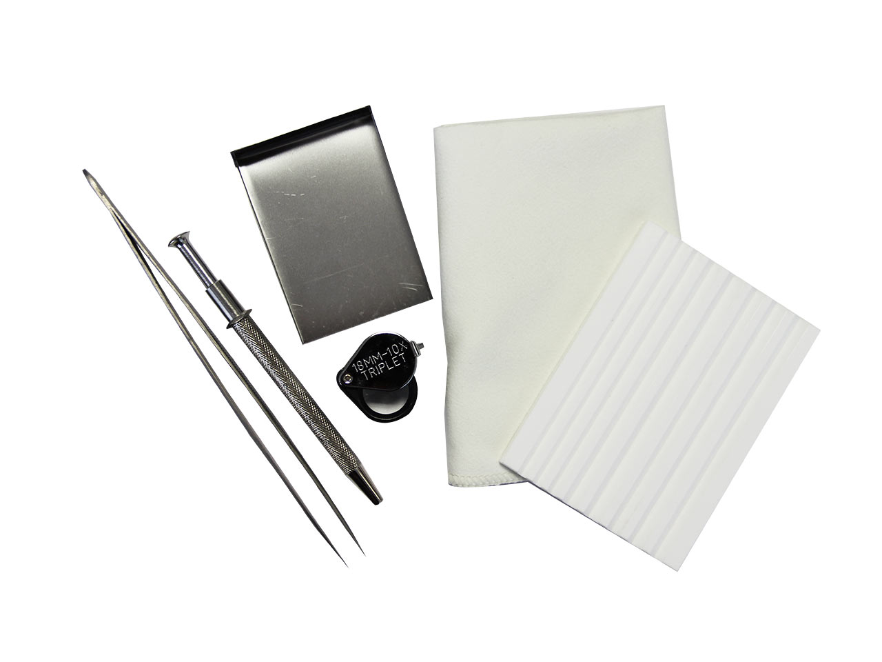 Set Für Diamantenhändler Mit Tablett, Schaufel, Steinpinzette, Lupe, Tuch Und Steinhalter
