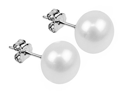 Weiße Süßwasserzuchtperlen-Ohrringe mit einem Durchmesser von 8-9 mm. Ohrringe an einem Kalottenstab befestigt, mit Verschluss aus 925er Silber.