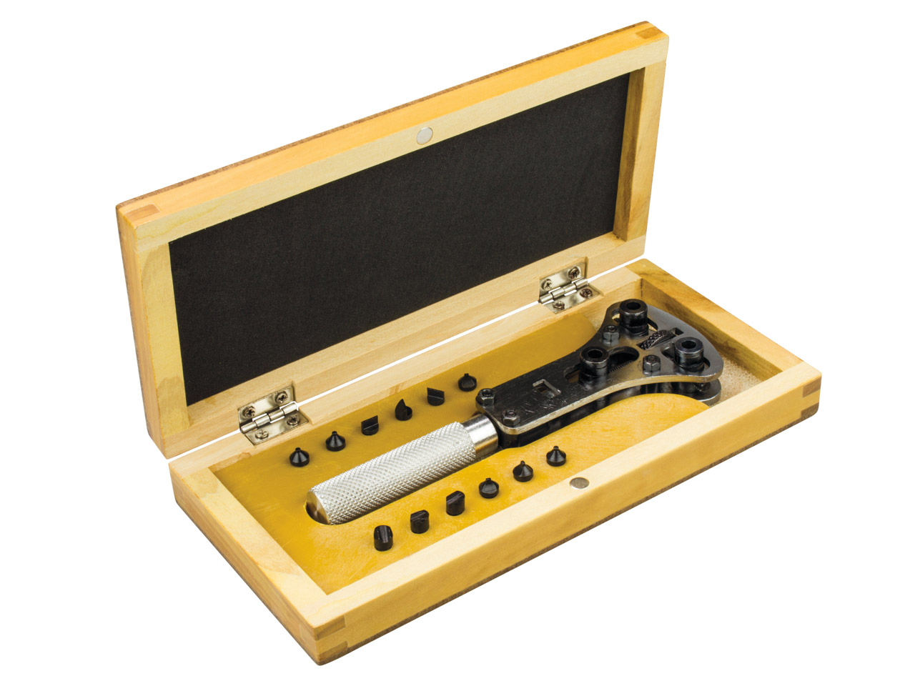 Schlüssel im Jaxa-Stil mit Griff zum Öffnen und Schließen von verschraubten Uhrengehäusen. Dank der drei Backen, die den Halt am Gehäuseboden verstärken, und des Griffs, der die Spannkraft verz...